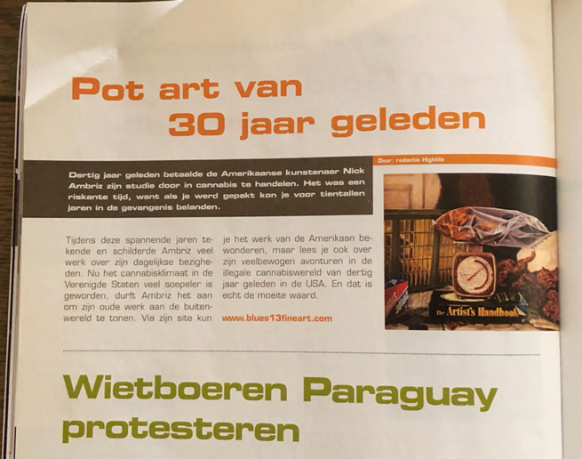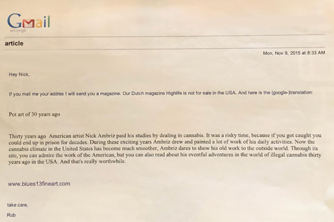 Introduction My name is Nick Ambriz. I have lived in the California Central Valley all my life. You will be viewing my works, which date from 40 to 45 years ago. They comprise the following periods: The late 60's, on through the 70's, and on into the early 80's. During those periods, while creating works of marijuana art, and apart from going to college, I led a clandestine existence. Initially, to put myself through school, I sold pot to pay the bills and to buy my art materials. This later led me into the world of dealing larger amounts of marijuana, in what at that time, was an emerging illegal enterprise. The two worlds became entwined with each other. An artist paints what he sees and that was marijuana art. My friends were other students, and also, people who dealt pot. Some of them were friends trying to start bands. Given that I was a fine art student, I always had a Canon camera with me. My friends, dealers, and such, got used to my presence with the camera. I would sit back and watch people engaged in their daily activities - particular activities associated with the early marijuana trade. Such as a scene of breaking kilos of pot, or working in a grow room. When I saw a view I liked, I would ask people to hold the 'pose,' and take a photo, capturing that moment. That is the story which is told through my works of fine art. Piece by piece; a brief conversation captured; something illegal you aren't supposed to notice,; everything looks normal, but you know there's something you just don't see. I captured those moments in my art. Because my body of work tells a story, this does not exactly put me within the strict confines of a particular school of art, such as photorealism. The photorealism movement was picking up speed at that time. The totally of my work tells a story. Each piece draws you in, to search for the detail of the moment, and challenges you to become part of the piece. No matter what your feeling about marijuana, each piece can stand on it's own through the intrinsic worth of its creation. Although I was part of the photorealistic style at the time, my principal artistic influences were Impressionists painters such as George Serat, Monet, Pizzaro, Goya, and Henri de Toulouse-Latrec, and others as well. While borrowing from the visual form of their works as an influence: I used their art as a catalyst into the method and exactitude of art, showing people a way of life they would never see, otherwise, during the course of everyday life. During the late 19th century, most people would never have seen the inside of a brothel. Toulouse-Latrec did. His affluent class of people rejected him because of his deformity, temperament, and his love of Absinthe. Yet others, whom, were likewise rejected by society, embraced him. As a tribute to those who valued his person, he painted their secret world. Gauguin captured life in Tahiti; Van Gogh expressed his world with his brilliant and tormented visions; and so followed Picasso with his various periods of expression. Each of them painted the clandestine, subterranean world of the absinthe drinkers. That is what my art attempts to do: take you on a, step by step, piece-by-piece trip through the drug culture of the 60's to the 80's: To go on a marijuana deal. To take your best friend to jail, and ask him if you can use his car for 30 days to stash your stash in! Sit in on a conversation with the Artichoke Band while they take a few hits. Alternatively, you can go on a marijuana deal in Oakhurst, or help break down a few pounds of marijuana, and weigh it out...