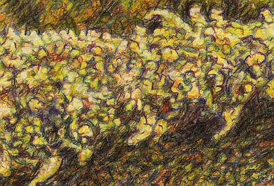 Description: “Bud Close-up, #A” (1983) We found a connection to get Hawaiian pot every year, from the years 1977 to 1982. Keithy, and his people, brought the pot over in sealed cans. The bud was not crushed - it was pristine. I grabbed my camera that had a bellows lens, and got some super close-ups of the buds. Nevertheless, I was working on a large 40" x 60" pencil drawing of one bud. The next three pieces to follow are work ups of a larger drawing. I used this technique to master the color in a particular part of the larger drawing.